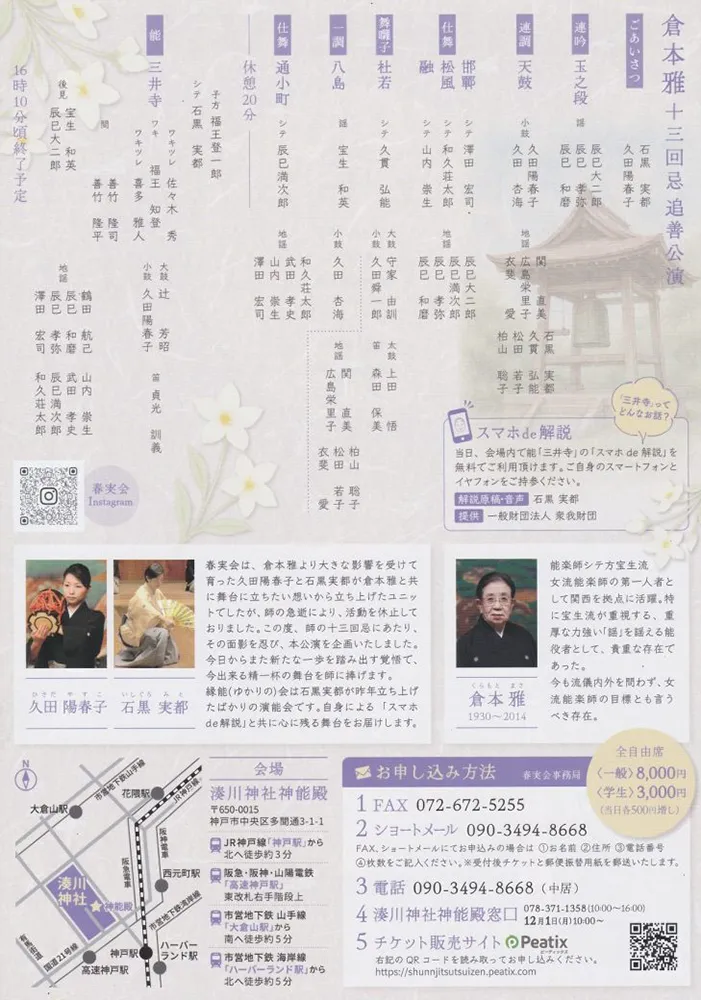 料金:一般8,000円、学生3,000円(当日各500円増し) 問い合わせ:湊川神社神能殿:078-371-1358