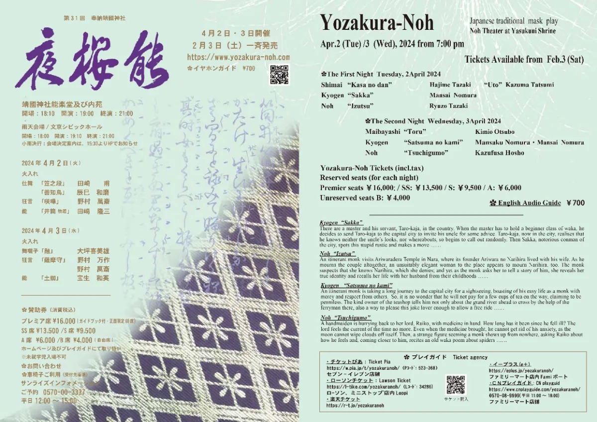 晴天時や小雨の場合は靖國神社 能楽堂にて開催いたします。