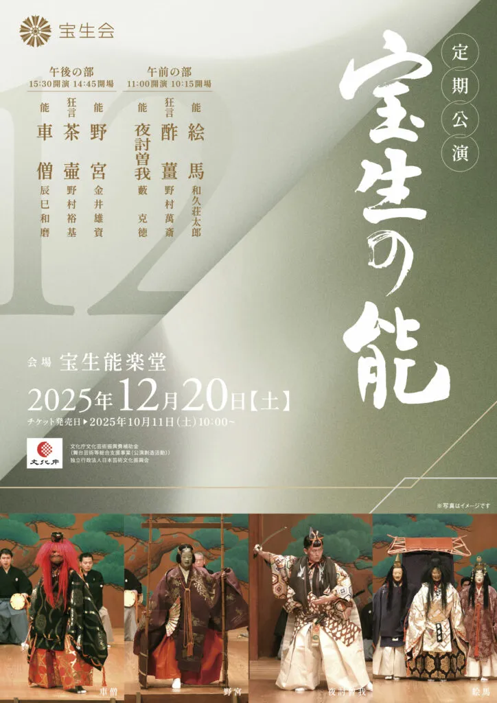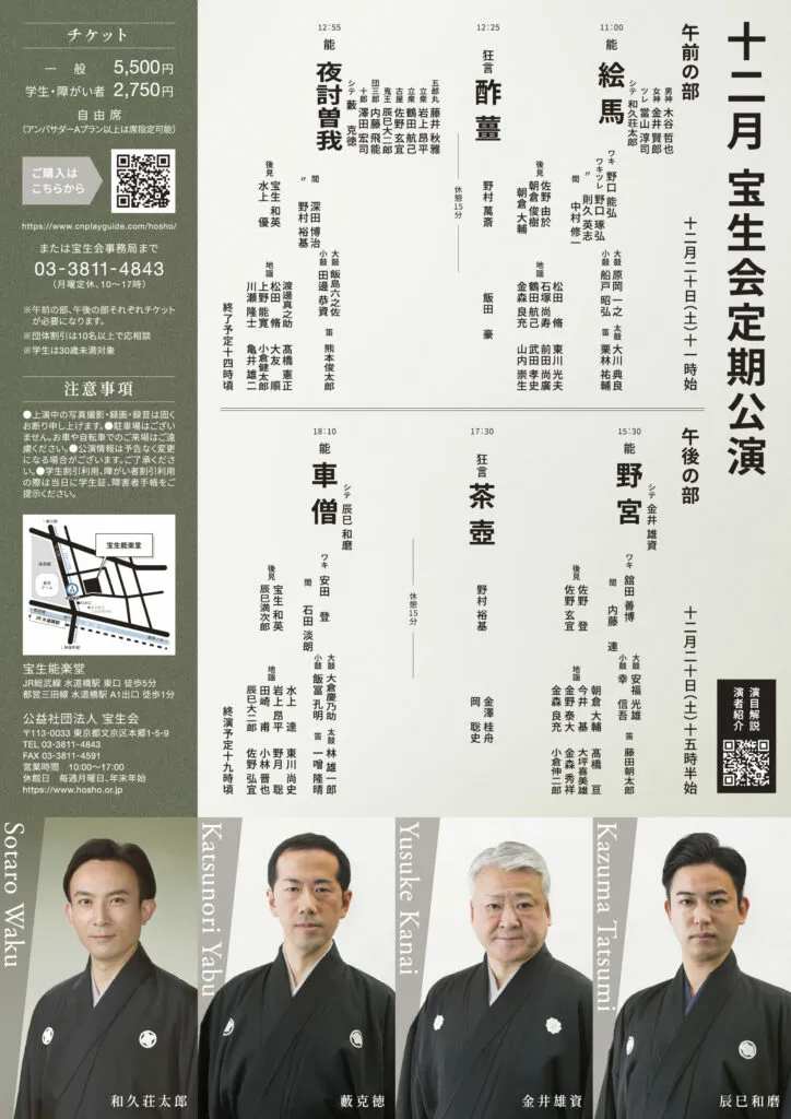 料金:一般 5,500円 学生 2,750円(当日学生証提示要) 全席自由席 問い合わせ:宝生会 TEL.03-3811-4843